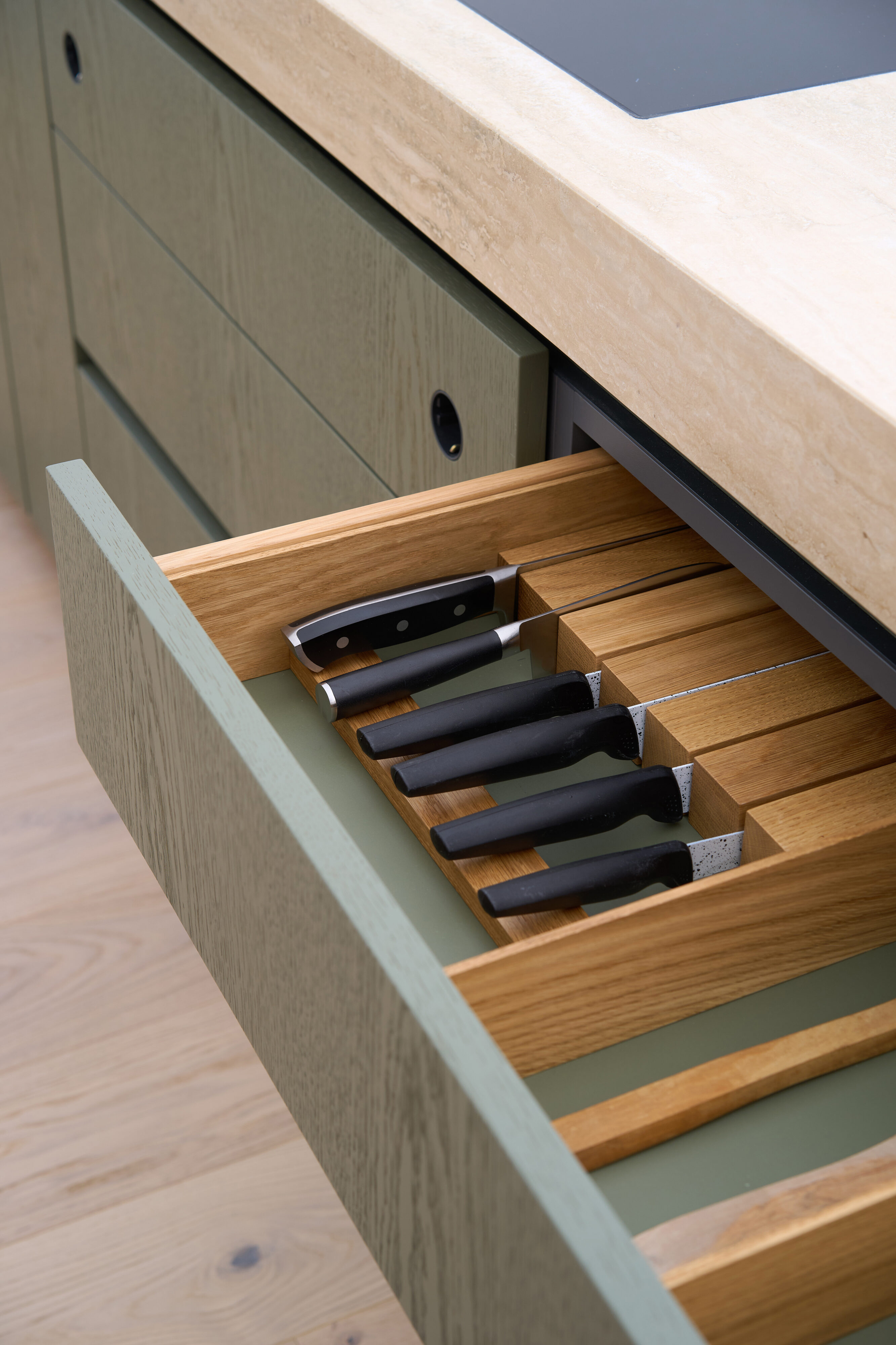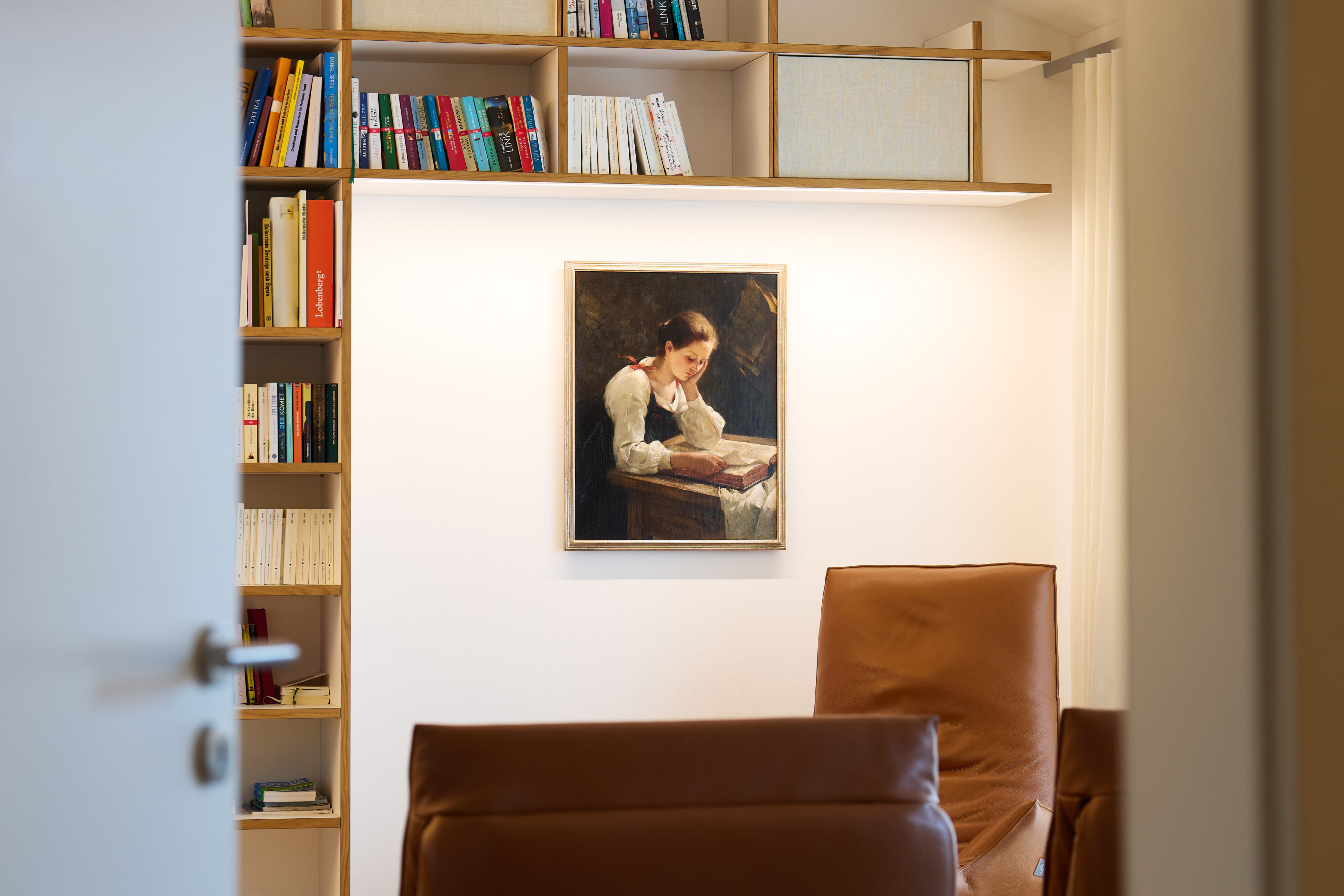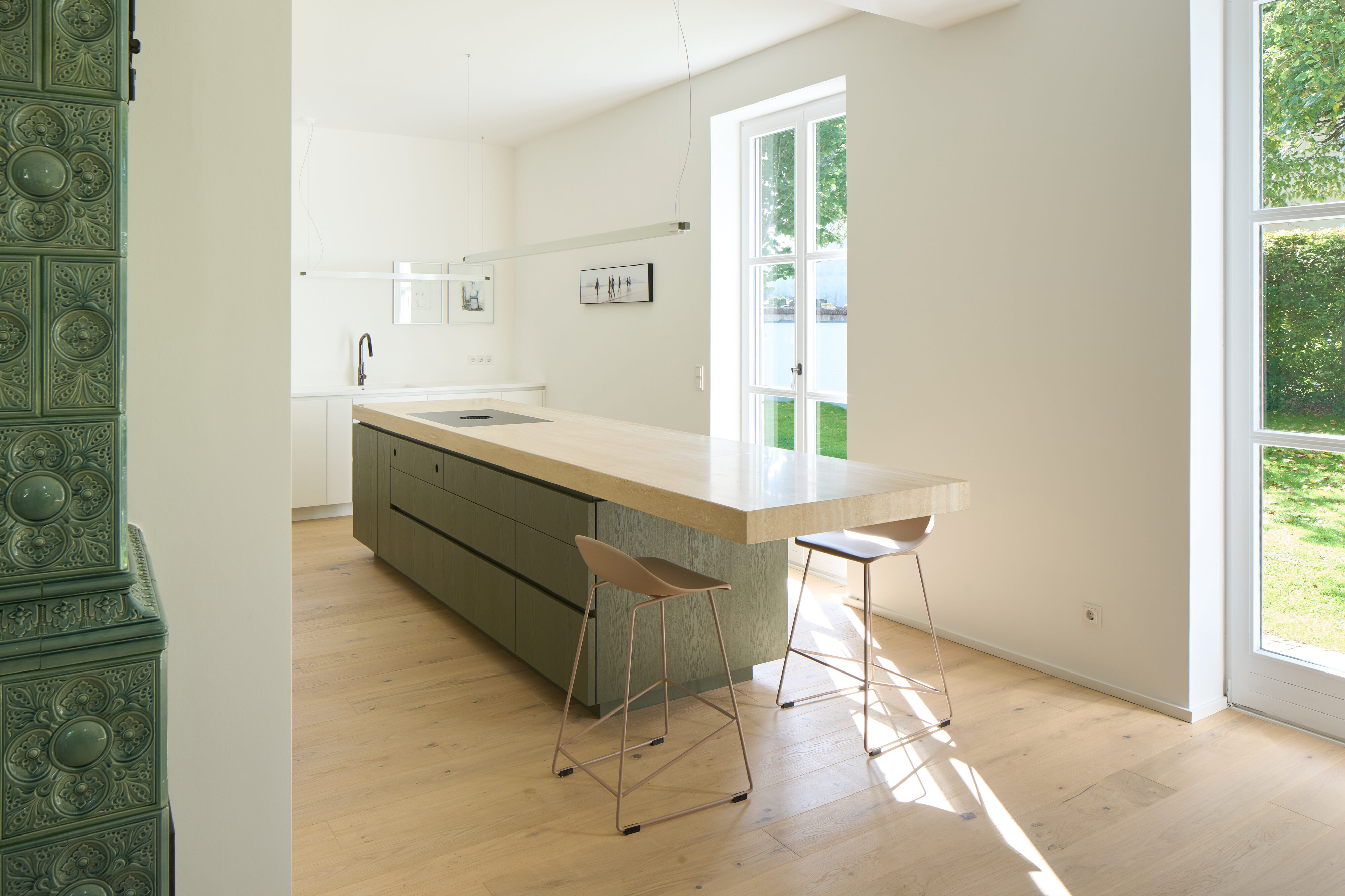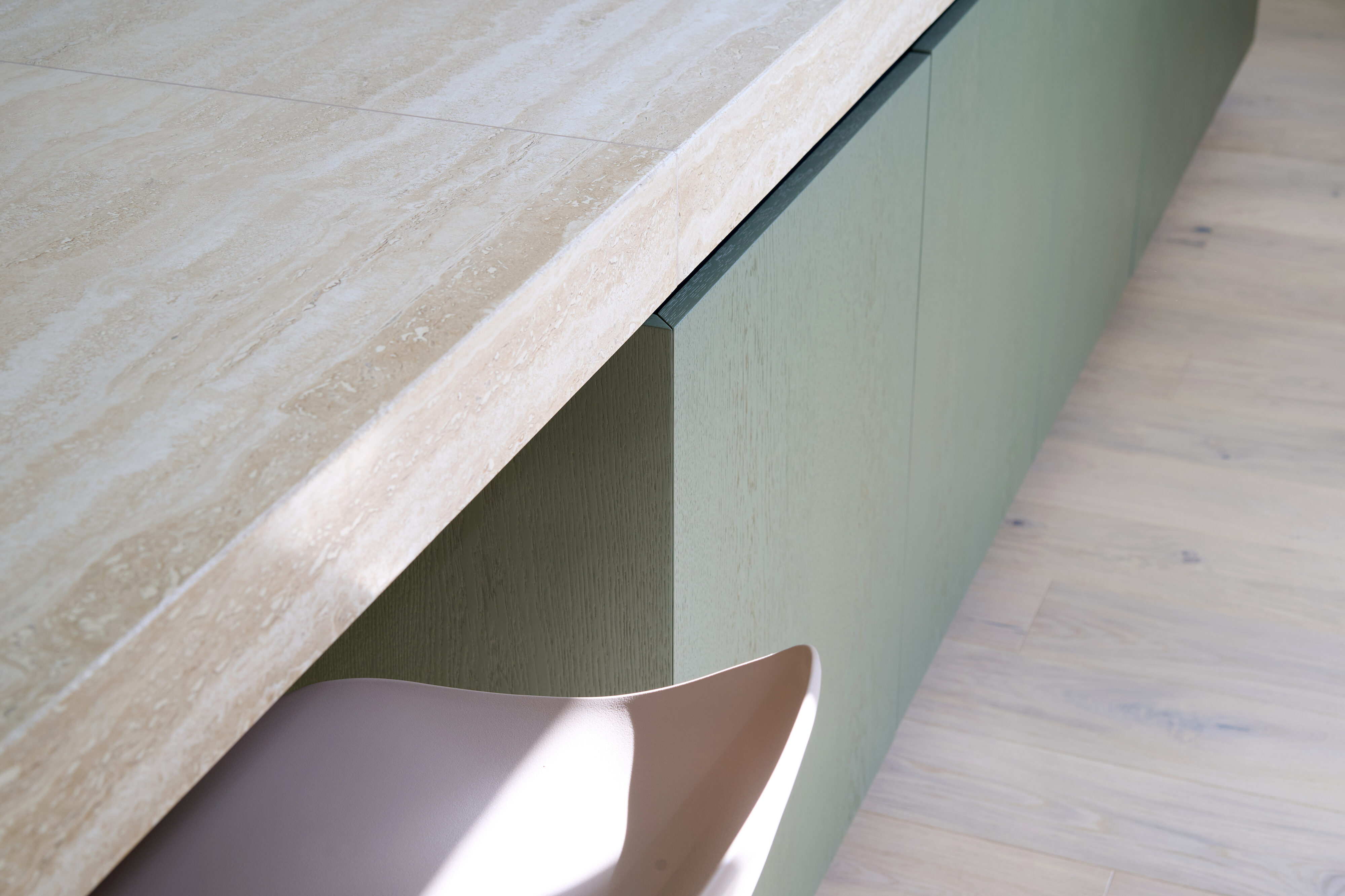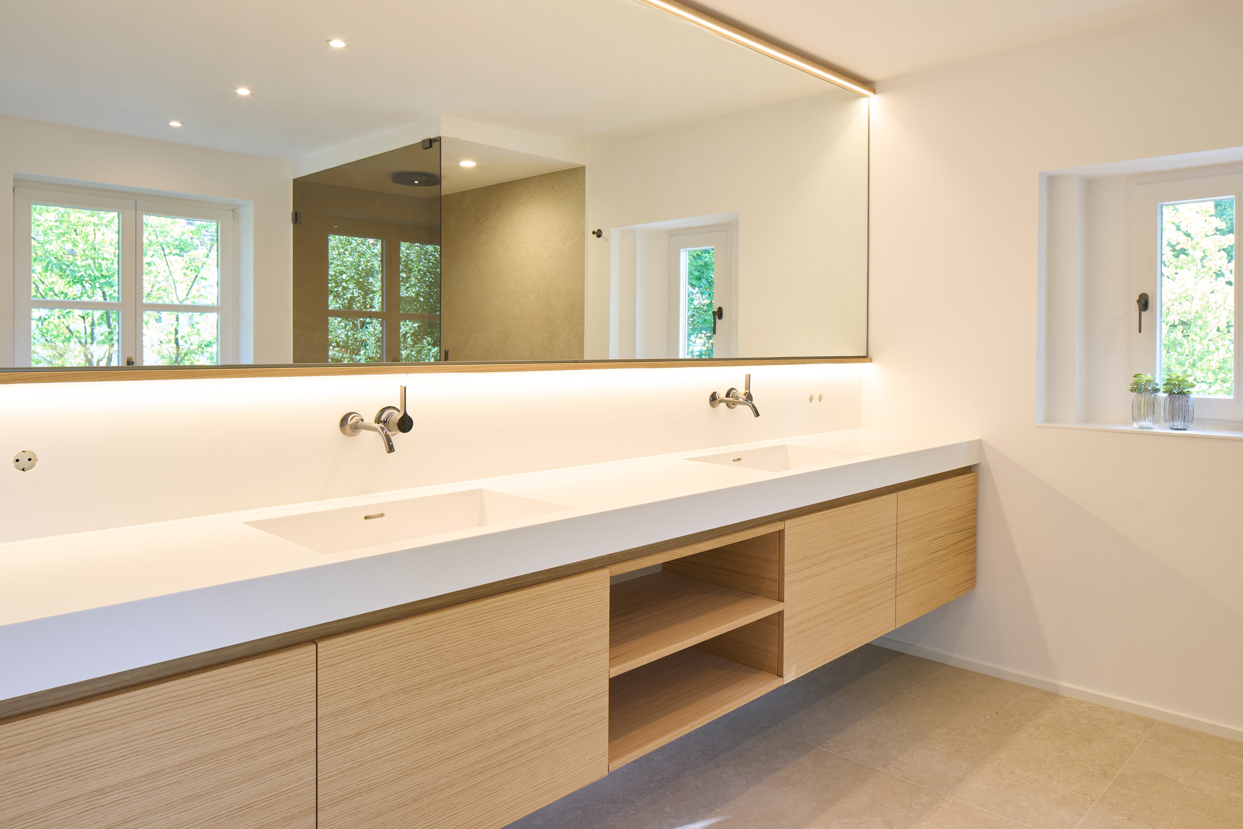Im Zuge des Projekts wurden auch zwei Bäder umgesetzt, die gestalterisch auf das Gesamtkonzept abgestimmt sind. Der Entwurf entstand in Zusammenarbeit mit dem Innenarchitekturbüro Studio Faubel und wurde in enger Abstimmung weiterentwickelt. Die Fronten sind in Eiche ausgeführt und bilden einen warmen Gegenpol zu den klaren, hellen Oberflächen der Waschtische aus Corian. Die Becken sind fugenlos in die Waschtische integriert und unterstreichen die ruhige, präzise Linienführung. Auch der Spritzschutz wurde aus Corian gefertigt und nimmt integrierte Steckdosen auf, die unauffällig in die Fläche eingebunden sind. So entstanden Bäder, die durch Material, Detailausbildung und Zurückhaltung überzeugen und das Projekt „un pezzo d’italia“ konsequent in die privaten Bereiche fortführen.