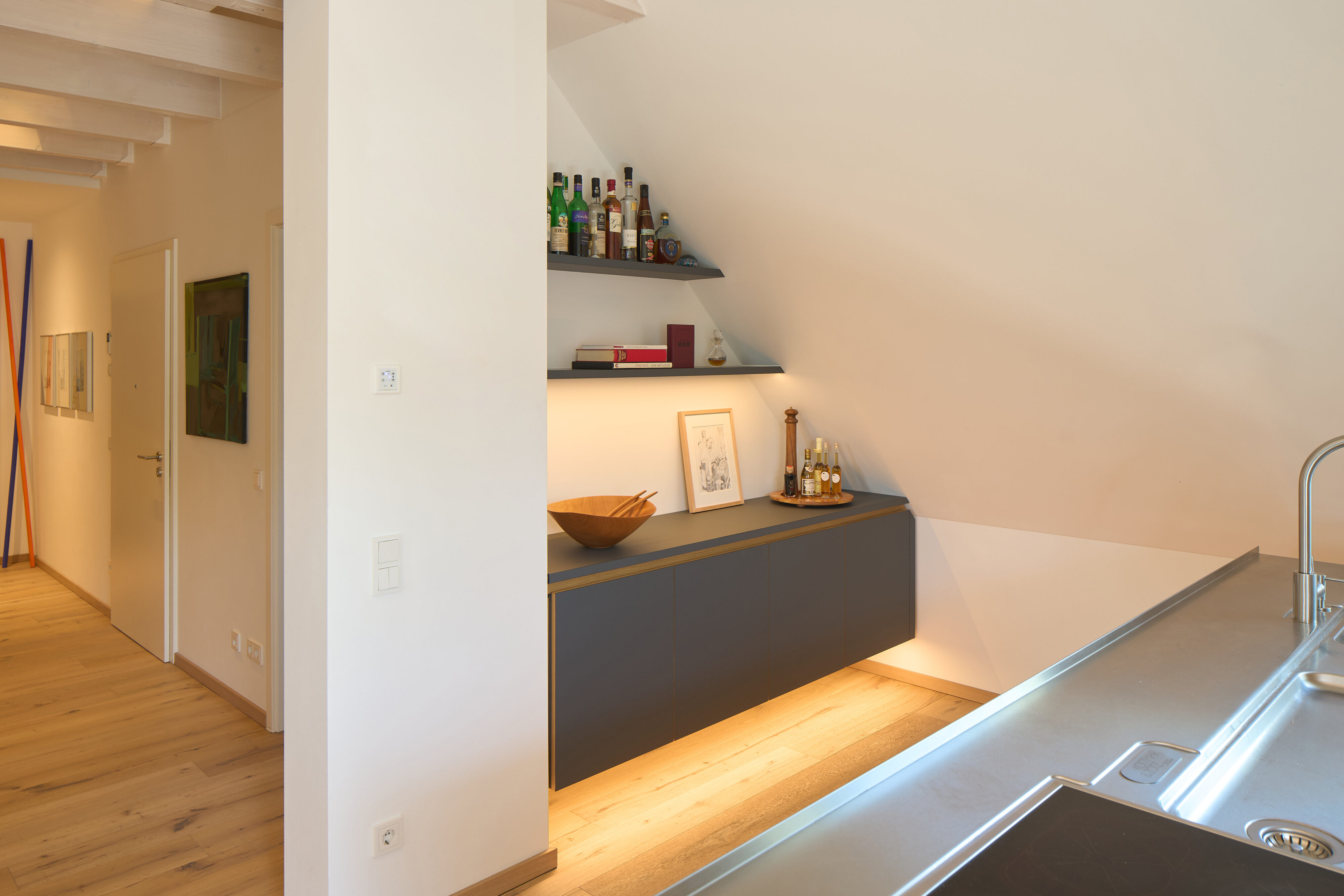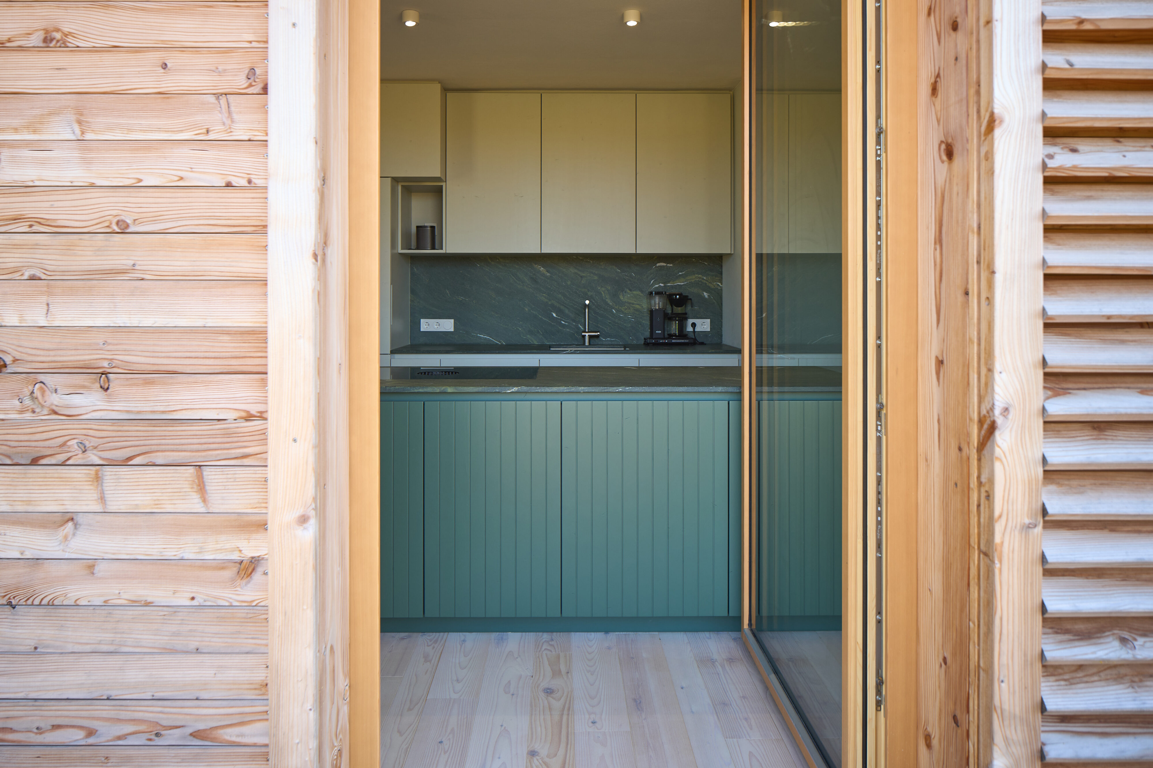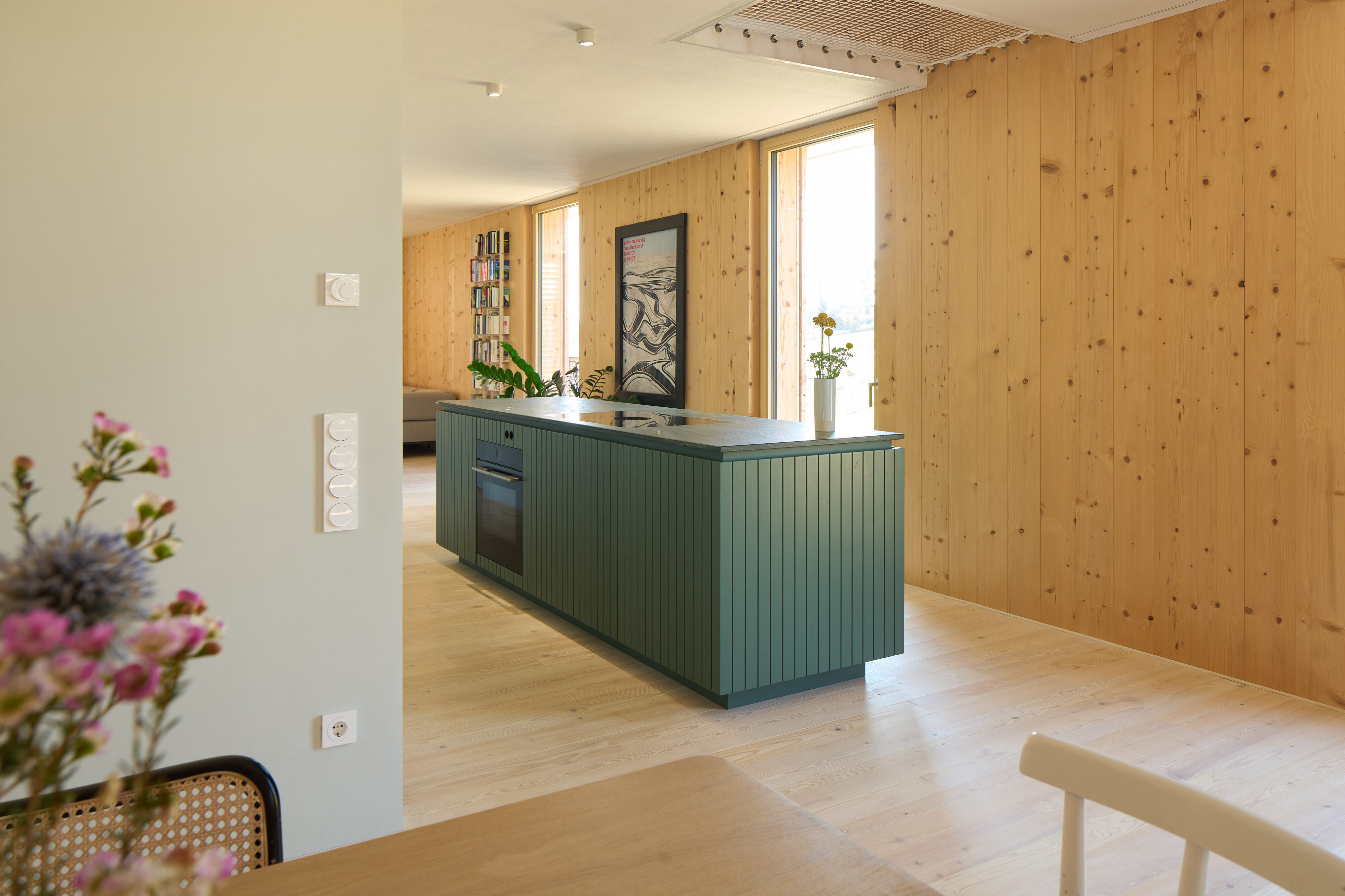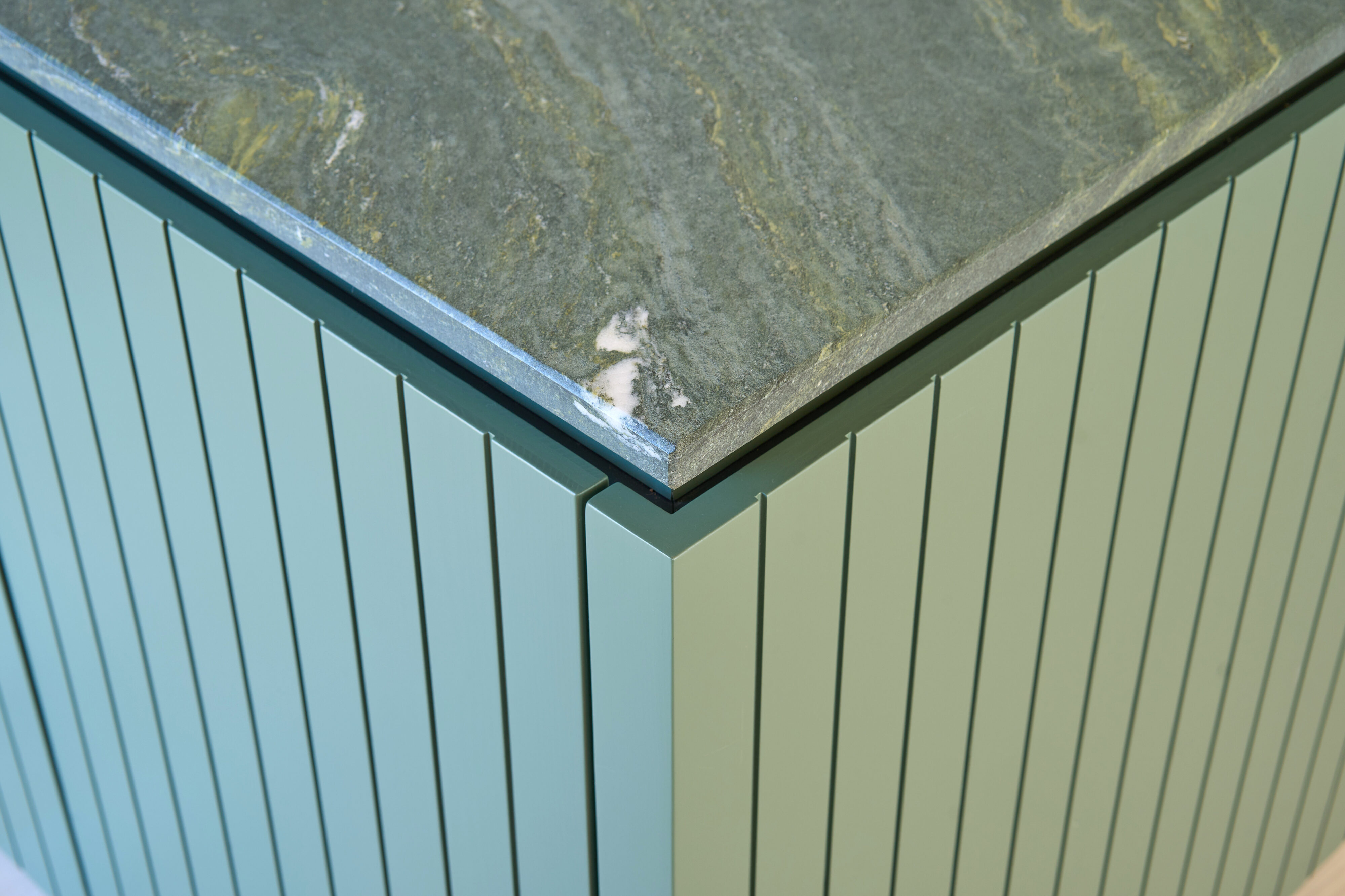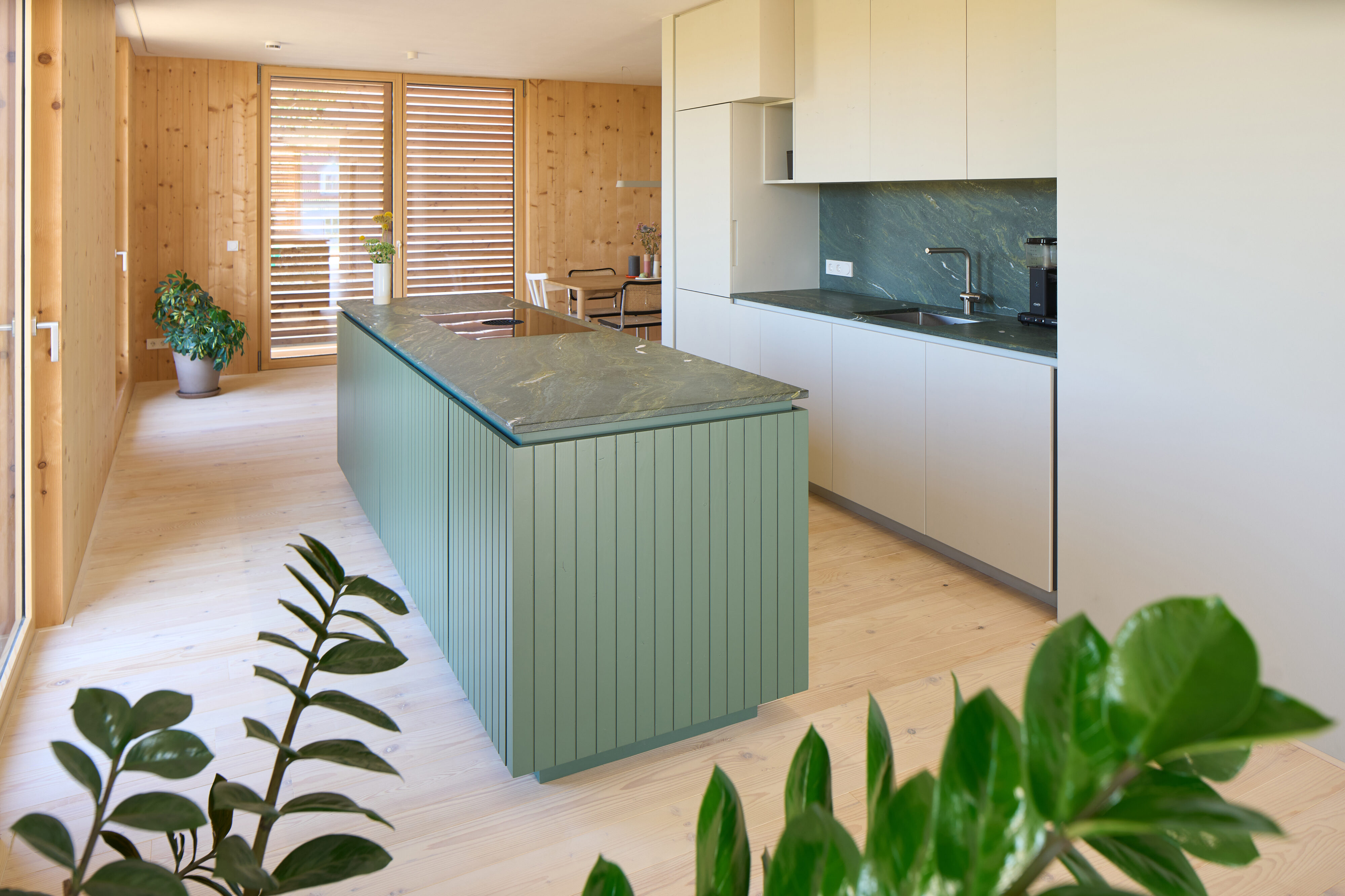 In Zusammenarbeit mit den Architekten von IFUB entstand eine Küche, deren Entwurf von uns handwerklich umgesetzt wurde. Die Arbeitsflächen aus grünem Naturstein „Alpengrün“ prägen den Ausdruck des Raumes und bilden den farblichen Bezugspunkt des gesamten Ensembles. Der Küchenblock wurde mit einem markanten Nutbild versehen, das eine klare Leistenoptik erzeugt. Die lasierte Oberfläche greift den Grünton des Natursteins auf und fasst Backofen sowie Kochfeld mit integriertem Abzug in einem ruhigen, eigenständigen Körper zusammen. Die gegenüberliegende Küchenzeile ist schlicht in Weiß gehalten und wird durch Hängeschränke ergänzt. Ein Spritzschutz aus Alpengrün verbindet beide Bereiche und schafft einen zurückhaltenden Übergang zwischen Arbeitszone und Stauraum. So entsteht eine ausgewogene Küche, in der Material, Farbe und Struktur präzise aufeinander abgestimmt sind.