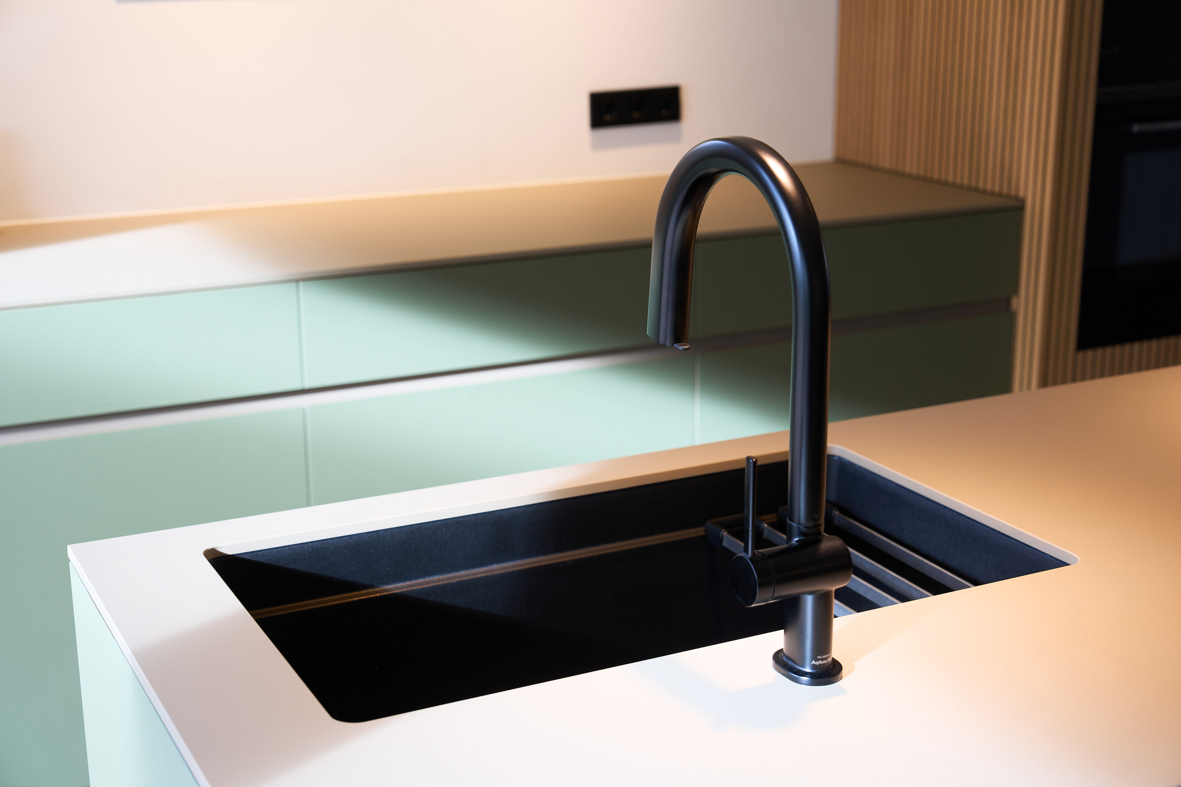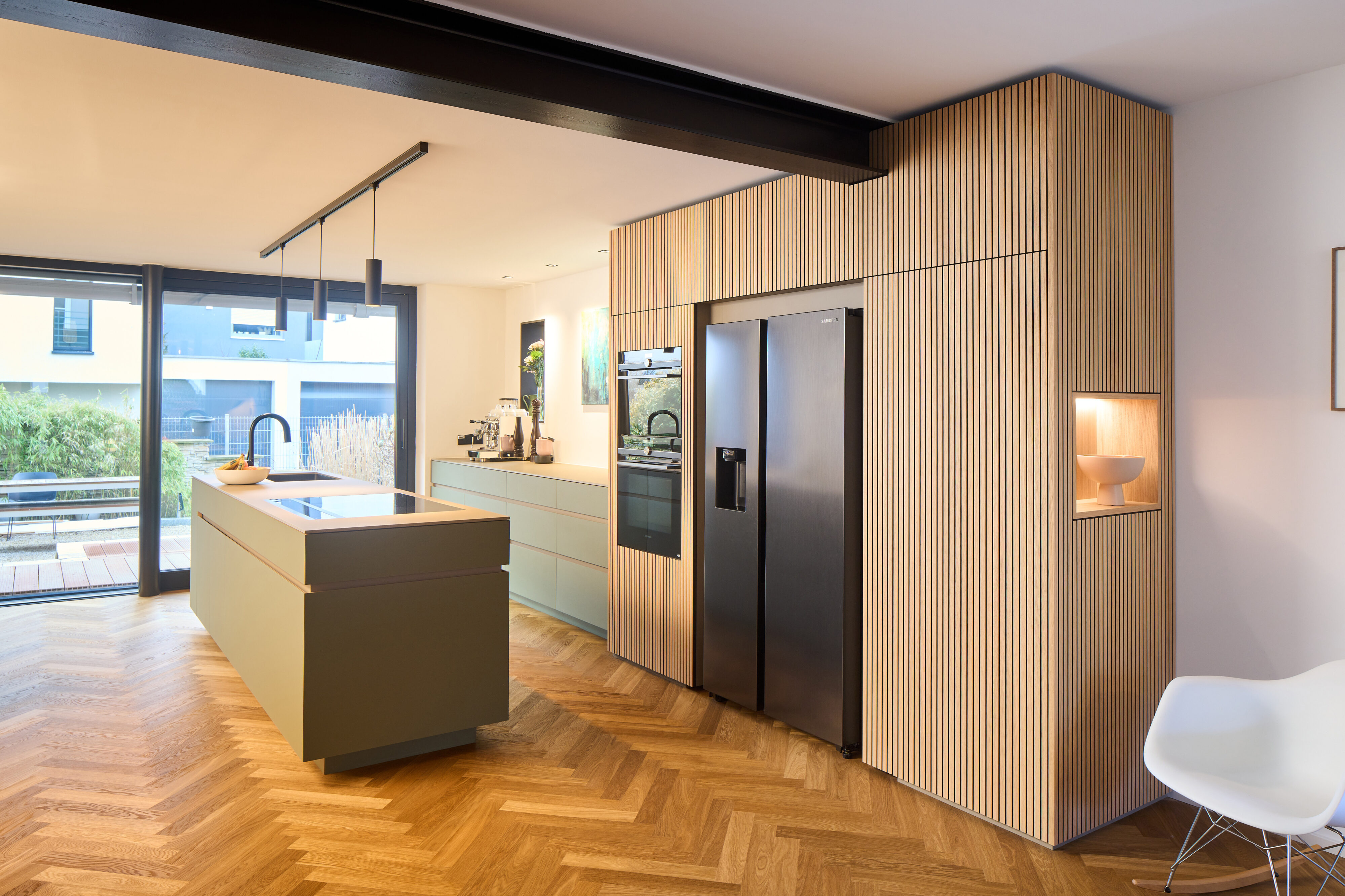 Der Entwurf dieser Küche entwickelte sich aus einer von Beginn an feststehenden Geräteauswahl. Der freistehende Kühlschrank bildete dabei den Ausgangspunkt. Dieser wurde mit Dampfgarer und Backofen in das in Eichen Lamellen Optik gestaltete Hochschrankelement integriert. Dazu kamen das groß dimensionierte Kochfeld mit frei nutzbaren Zonen, der dahinterliegende Down-Draft-Abzug sowie die Armatur mit Trinkwasserbereitung, welche in eine großzügig gestaltete Kochinsel eingefügt wurden, die die Funktionen bündelt und dem Raum eine klare Struktur gibt. Diese wurde in olivfarbenem Desktop-Linoleum ausgeführt. Die Kombination aus ruhiger Farbfläche und der vertikalen Gliederung der Lamellen verleiht der Küche eine ausgewogene und wohnliche Anmutung. So entstand ein zurückhaltender, präzise geplanter Küchenraum, der die technischen Anforderungen selbstverständlich aufnimmt und in ein stimmiges Gesamtbild überführt.
