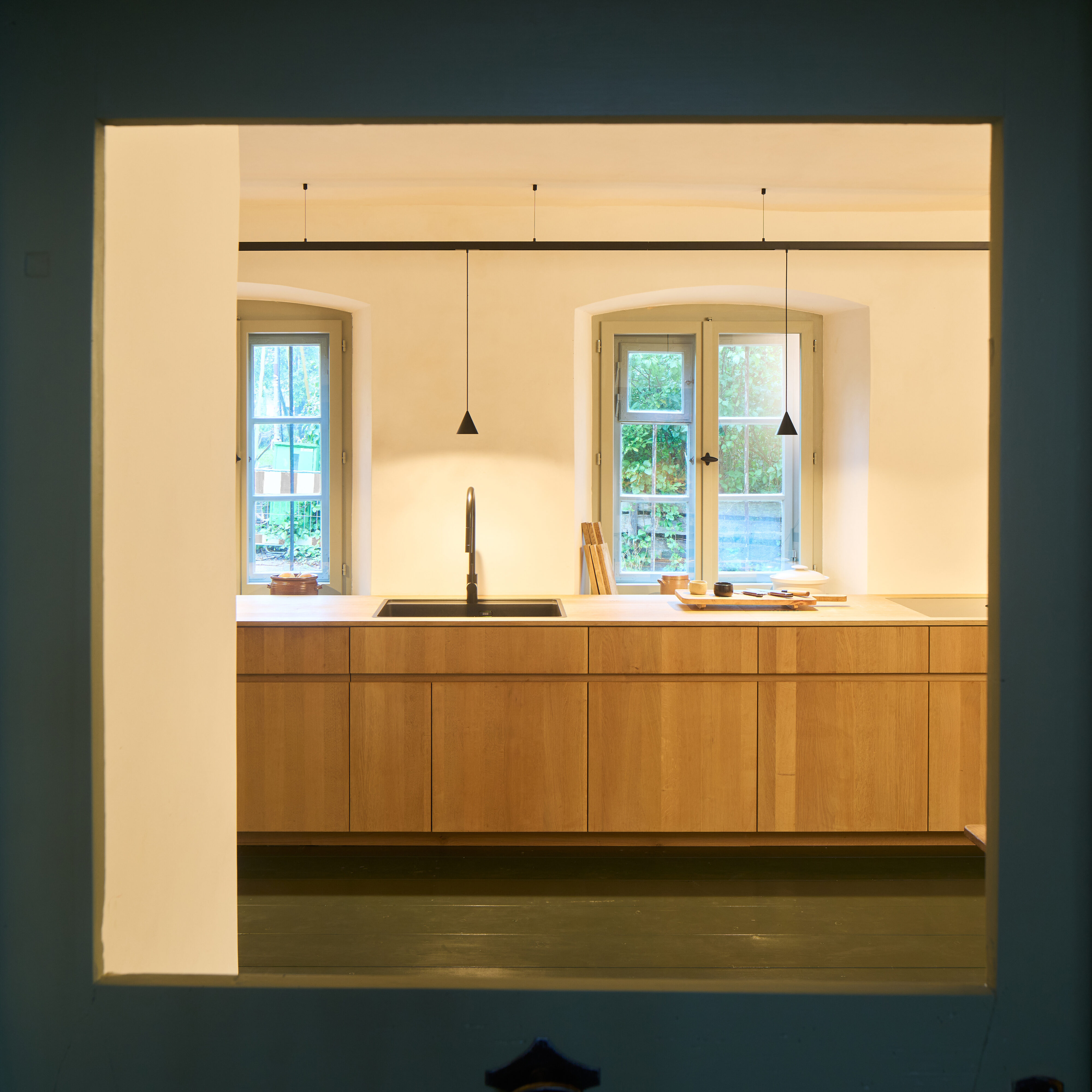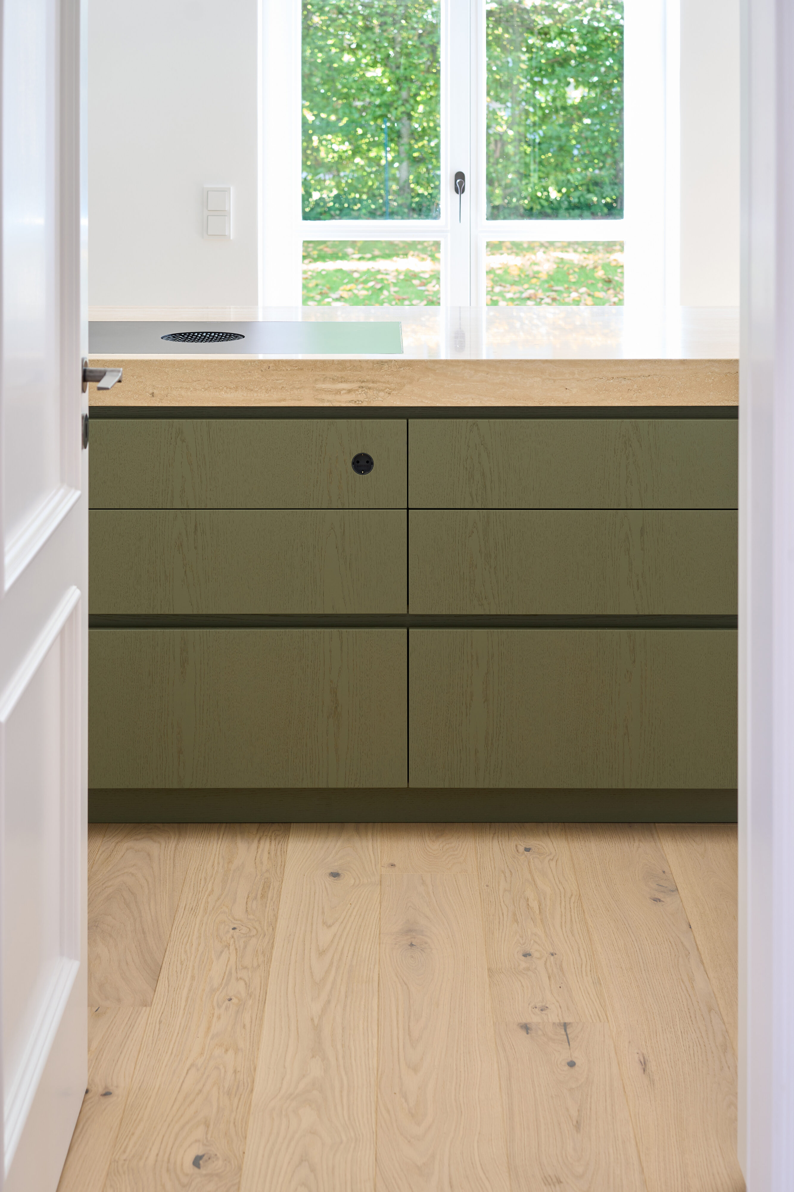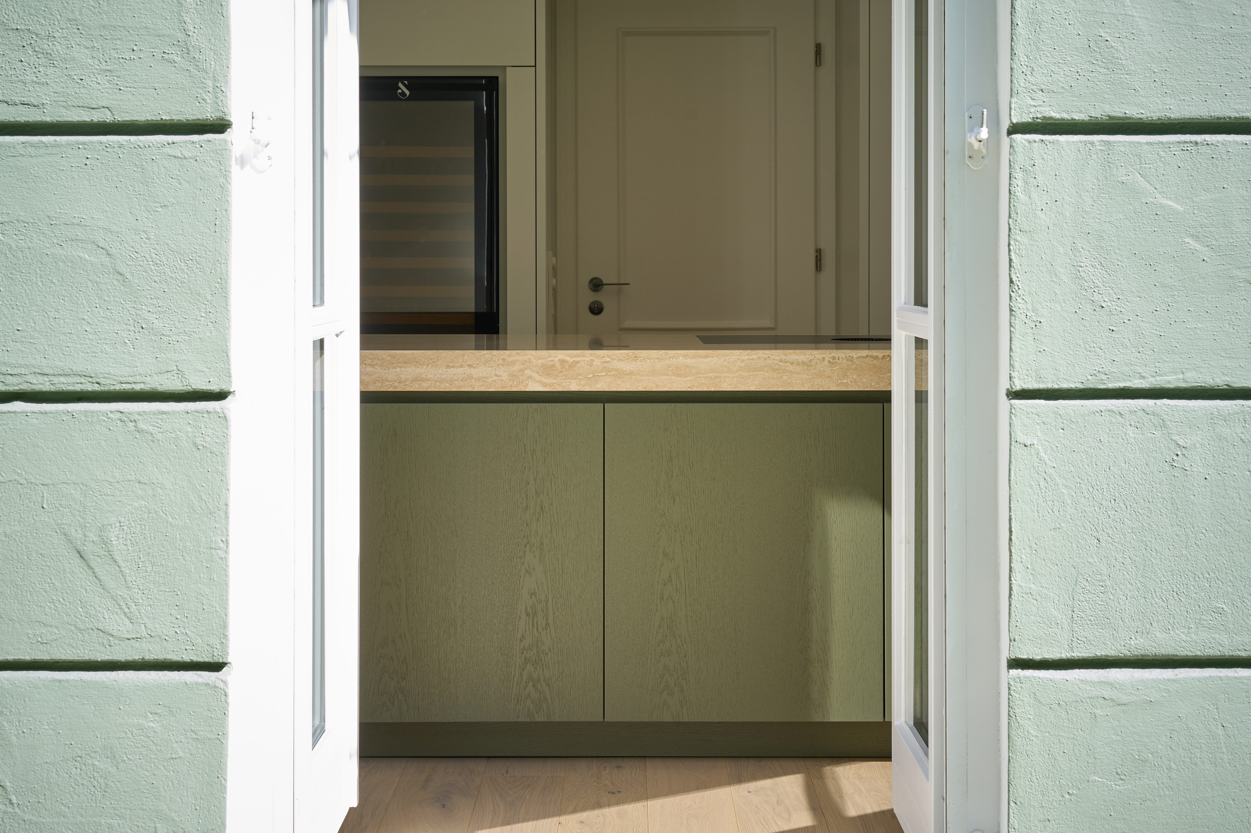 Namensgebend für dieses Projekt ist das Herzstück der Küche: die auskragende Arbeitsplatte des Küchenblocks aus toskanischem Travertin. Der Naturstein verleiht dem Raum eine besondere Präsenz und setzt einen klaren Akzent innerhalb des ansonsten zurückhaltenden Entwurfs. Im Zuge der Umsetzung wurde der bestehende Grundriss neu geordnet und eine Wand entfernt, um den Küchenbereich großzügiger auszubilden. Dadurch konnte die Küche stärker in den Wohnraum eingebunden und räumlich erweitert werden. Die Fronten sind in weißem Schleiflack ausgeführt und bilden einen ruhigen Hintergrund für den markanten Block. Dessen Unterbau wurde aus offenporiger Eiche gefertigt und in Jägergrün lackiert, wodurch ein warmer, erdiger Kontrast zum hellen Erscheinungsbild entsteht. Das Lichtkonzept für den Raum sowie eine eigens entwickelte Hängeleuchte stammen vom Innenarchitekturbüro Studio Faubel, das Teil der „Jocher 8“ Gemeinschaft ist. Die Planung erfolgte in enger Abstimmung mit uns und den Bauherren und ergänzt den Entwurf um eine präzise gesetzte, atmosphärische Lichtführung.