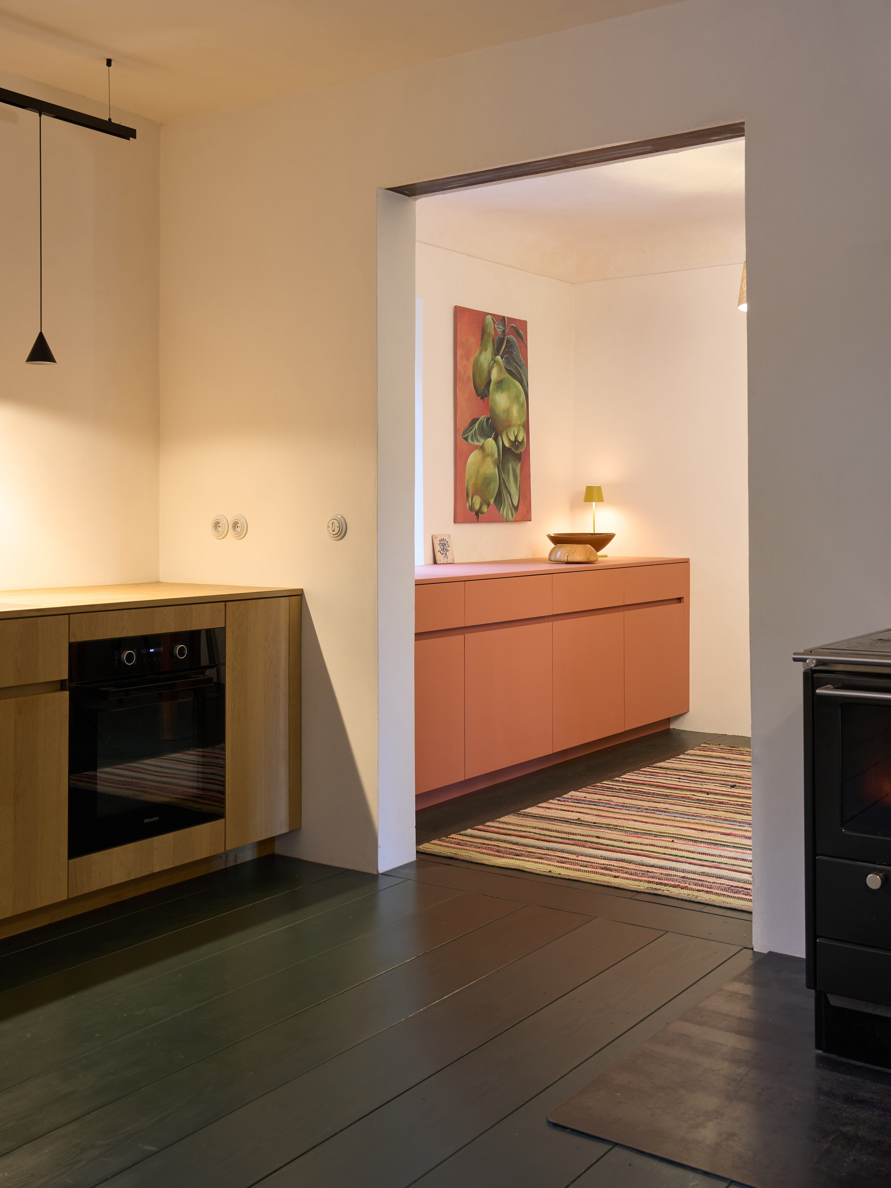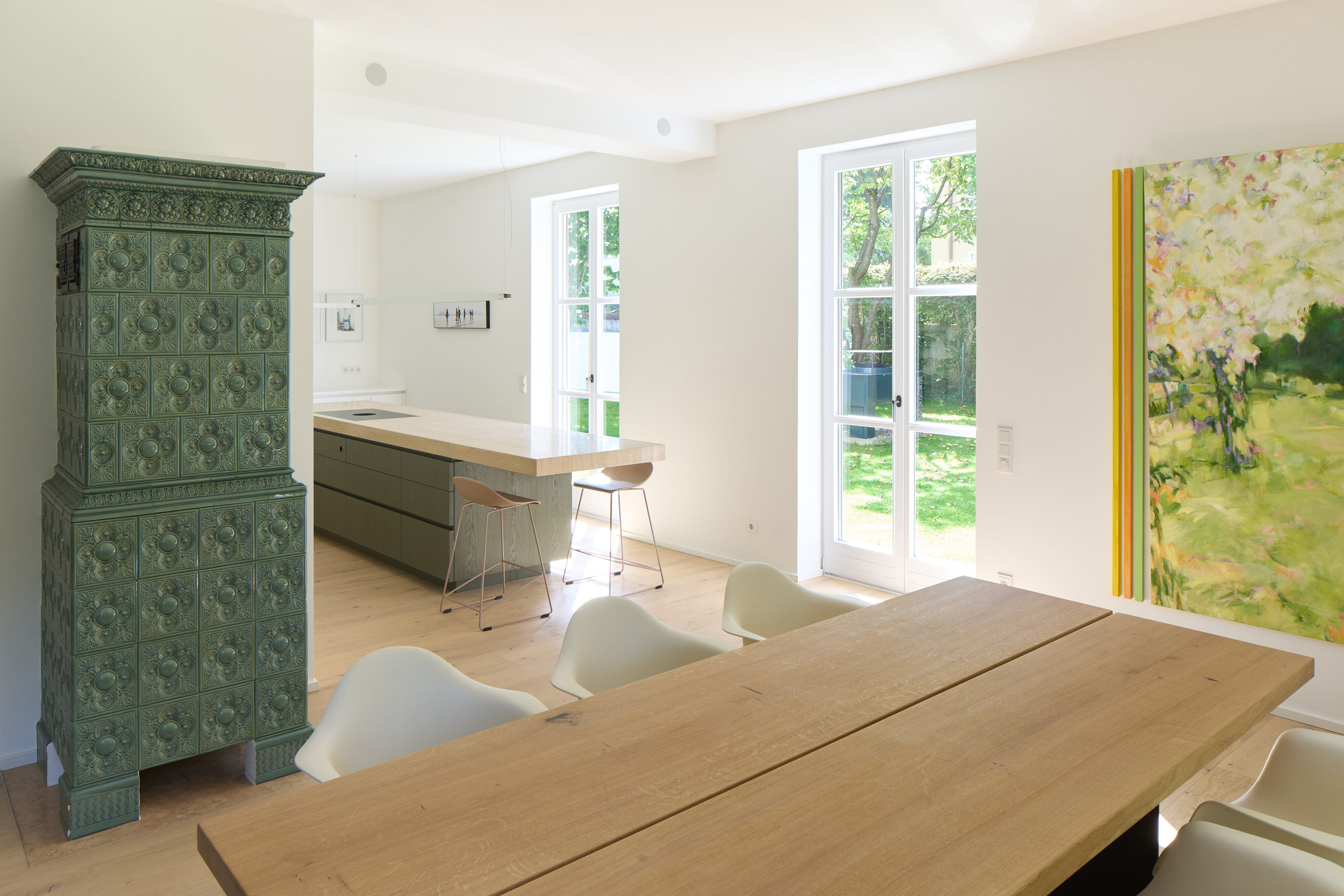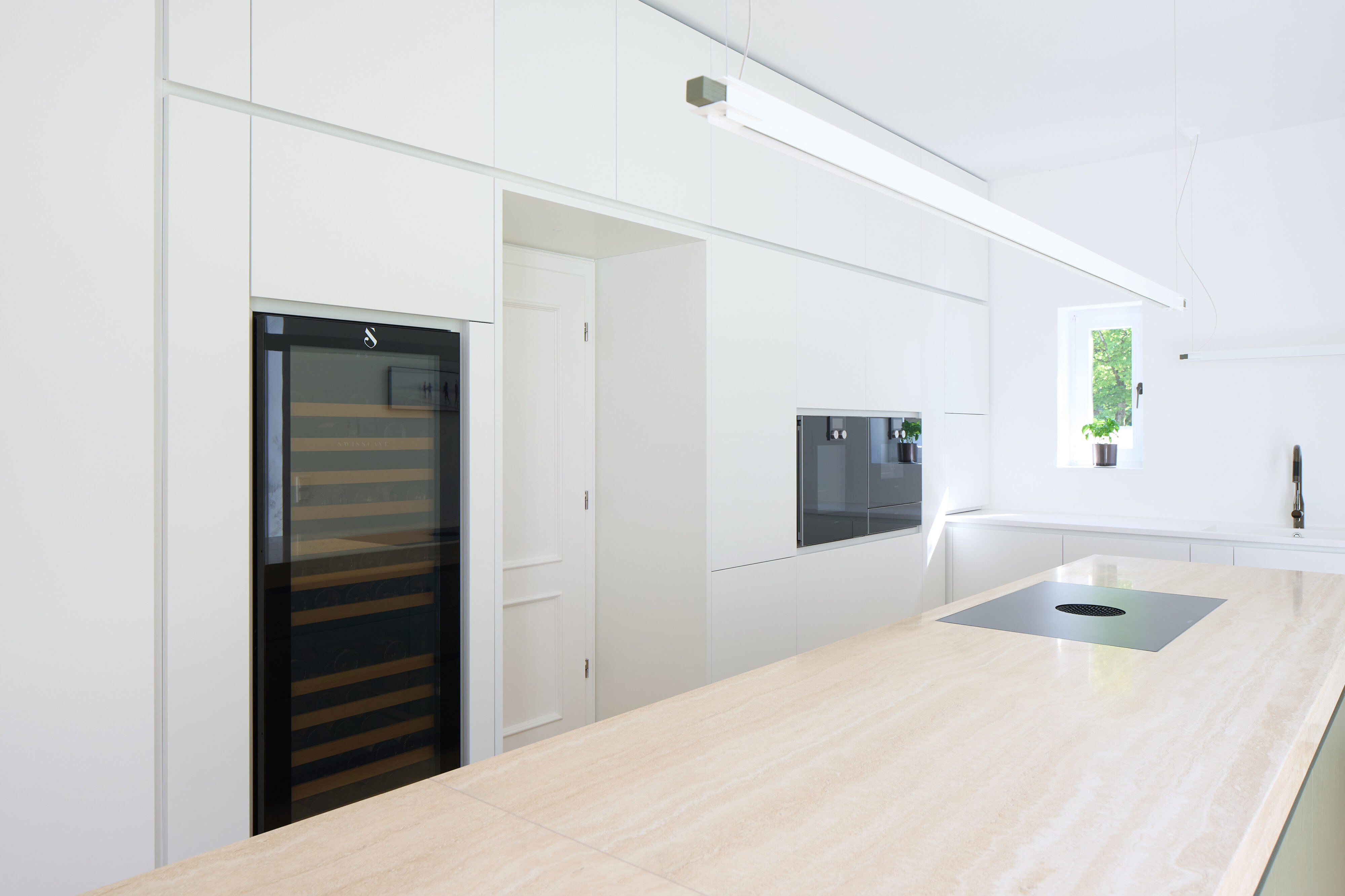 Namensgebend für dieses Projekt ist das Herzstück der Küche: die auskragende Arbeitsplatte des Küchenblocks aus toskanischem Travertin. Der Naturstein verleiht dem Raum eine besondere Präsenz und setzt einen klaren Akzent innerhalb des ansonsten zurückhaltenden Entwurfs. Im Zuge der Umsetzung wurde der bestehende Grundriss neu geordnet und eine Wand entfernt, um den Küchenbereich großzügiger auszubilden. Dadurch konnte die Küche stärker in den Wohnraum eingebunden und räumlich erweitert werden. Die Fronten sind in weißem Schleiflack ausgeführt und bilden einen ruhigen Hintergrund für den markanten Block. Dessen Unterbau wurde aus offenporiger Eiche gefertigt und in Jägergrün lackiert, wodurch ein warmer, erdiger Kontrast zum hellen Erscheinungsbild entsteht. Das Lichtkonzept für den Raum sowie eine eigens entwickelte Hängeleuchte stammen vom Innenarchitekturbüro Studio Faubel, das Teil der „Jocher 8“ Gemeinschaft ist. Die Planung erfolgte in enger Abstimmung mit uns und den Bauherren und ergänzt den Entwurf um eine präzise gesetzte, atmosphärische Lichtführung.