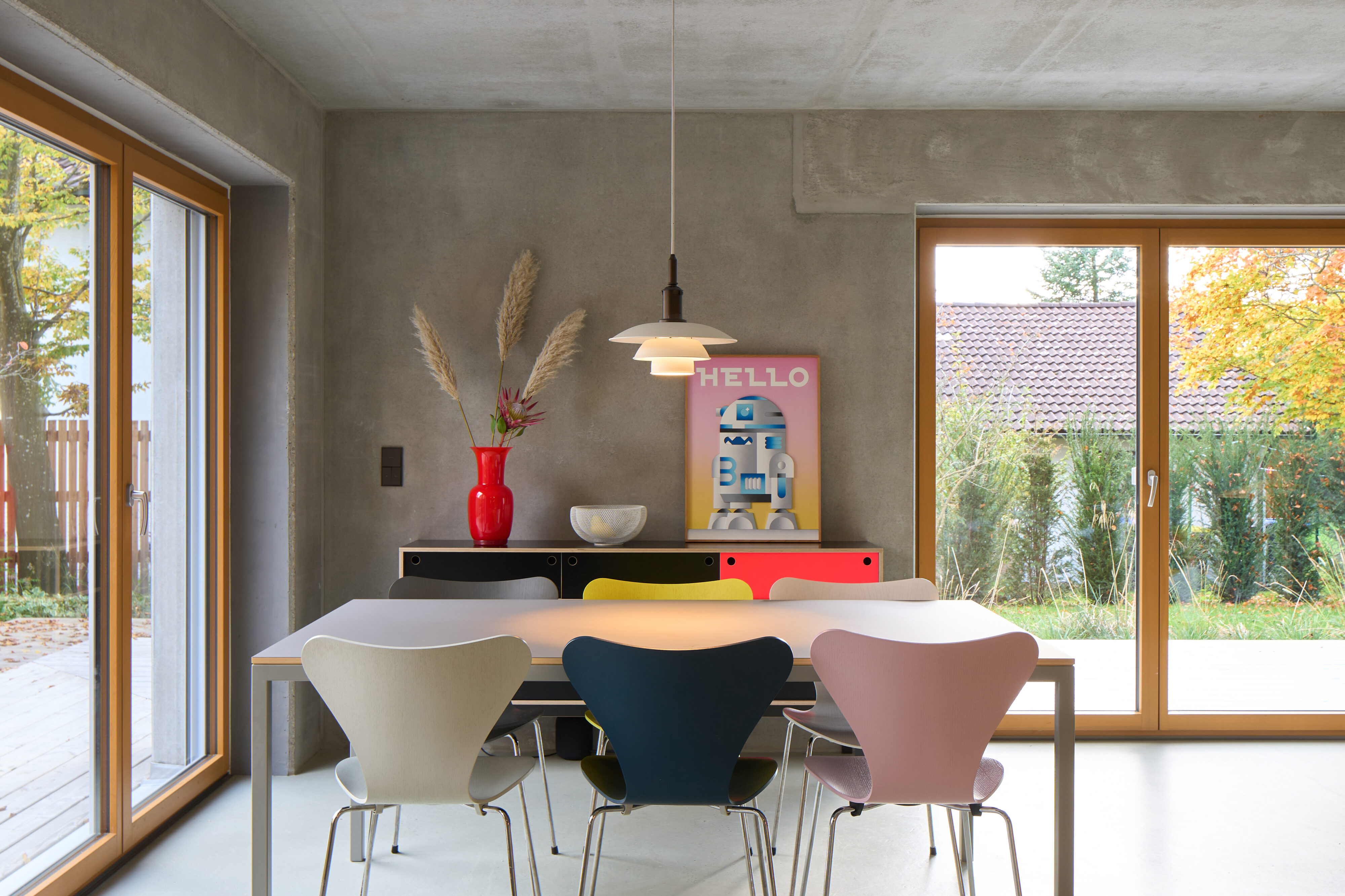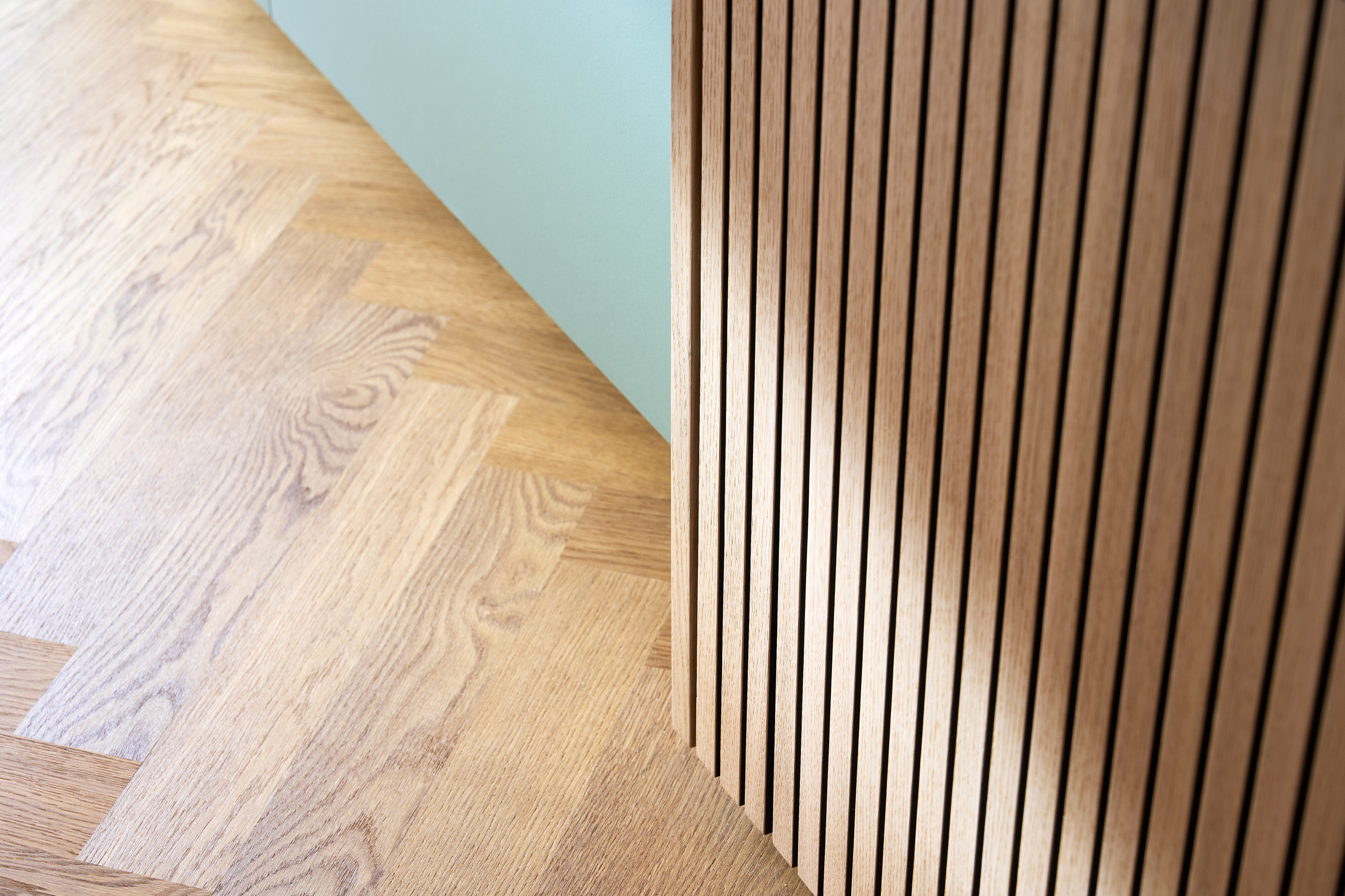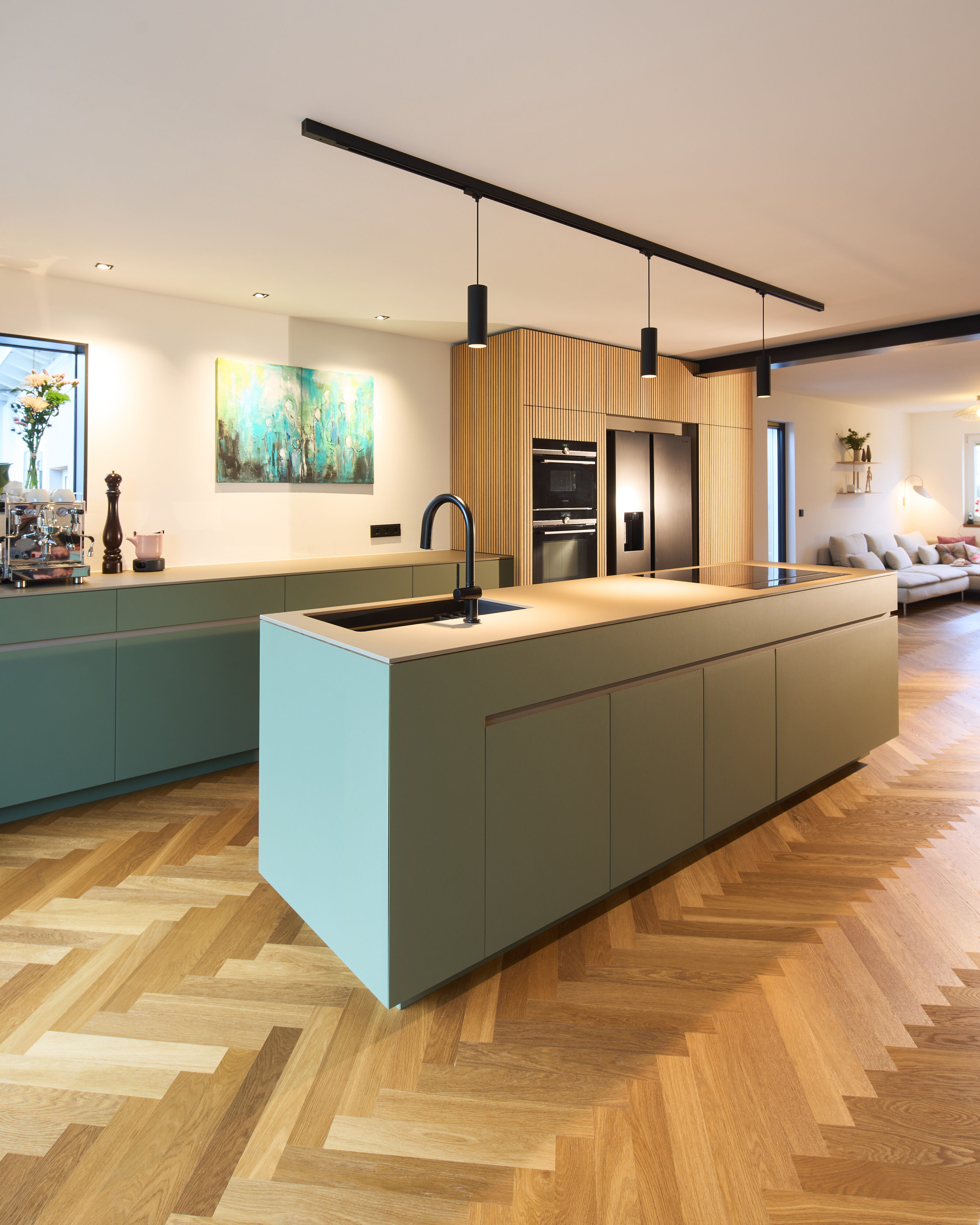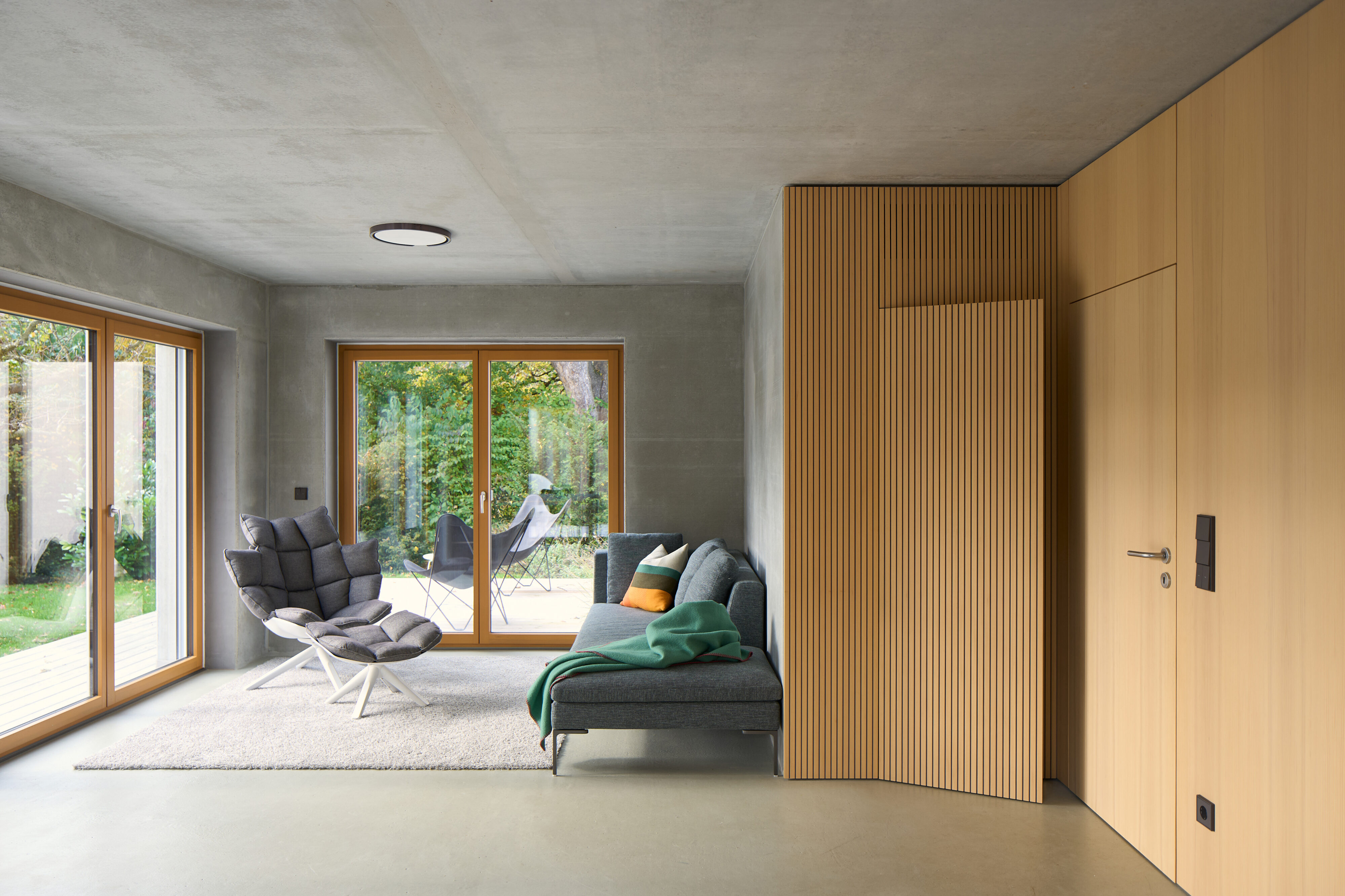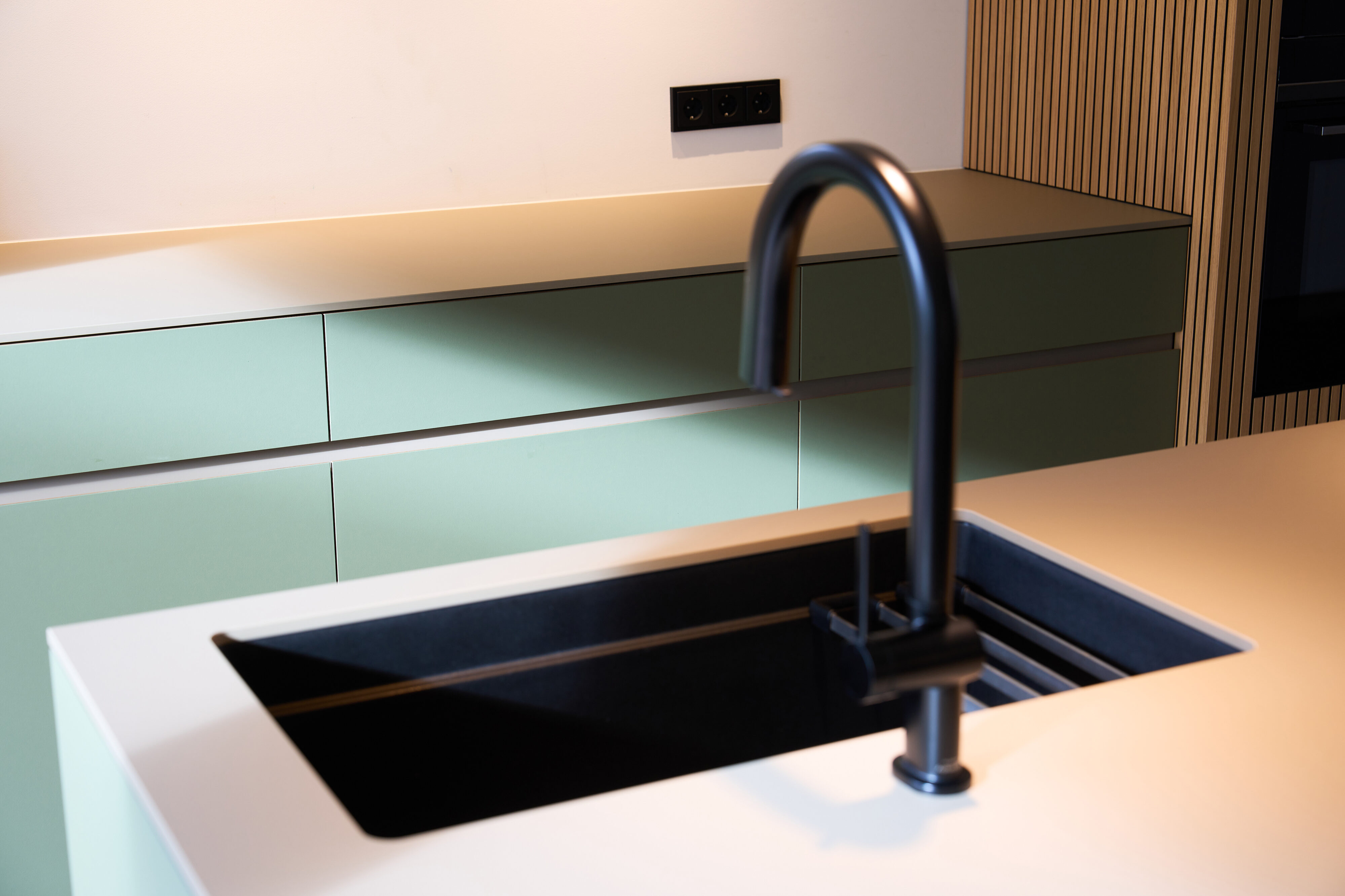 Im Rahmen des Innenausbaus dieser Vorstadtküche bestand die zentrale Aufgabe darin, die ursprüngliche bauliche Situation neu zu ordnen. Das Haus wurde mit zahlreichen Trockenbauwänden und einem sichtbar geführten Lüftungssystem übernommen, die den Raum unruhig erscheinen ließen. Ziel des Entwurfs war es, die klaren Betonelemente des Gebäudes freizustellen und alle weiteren technischen Ergänzungen unauffällig zu integrieren. Die Materialität basiert auf Weisstannenfurnier – teilweise in Lamellenoptik – sowie grauem Ultramatt-Schichtstoff. Diese Kombination unterstützt die ruhige, zurückhaltende Wirkung des Entwurfs und fügt sich selbstverständlich in die Betonarchitektur des Hauses ein. Die Küchenzeile bildet ein mäanderndes Band, das als eigenständiger Körper im Raum steht. Sie gliedert sich an einen ausgeklinkten Kubus aus Weißtanne an, in dem die Türen zum Eingangsbereich und zur Speisekammer unauffällig integriert sind. Durch dieses Zusammenspiel entsteht eine klare, geordnete Struktur, die den Raum beruhigt und die vorhandene Architektur präzise aufnimmt.