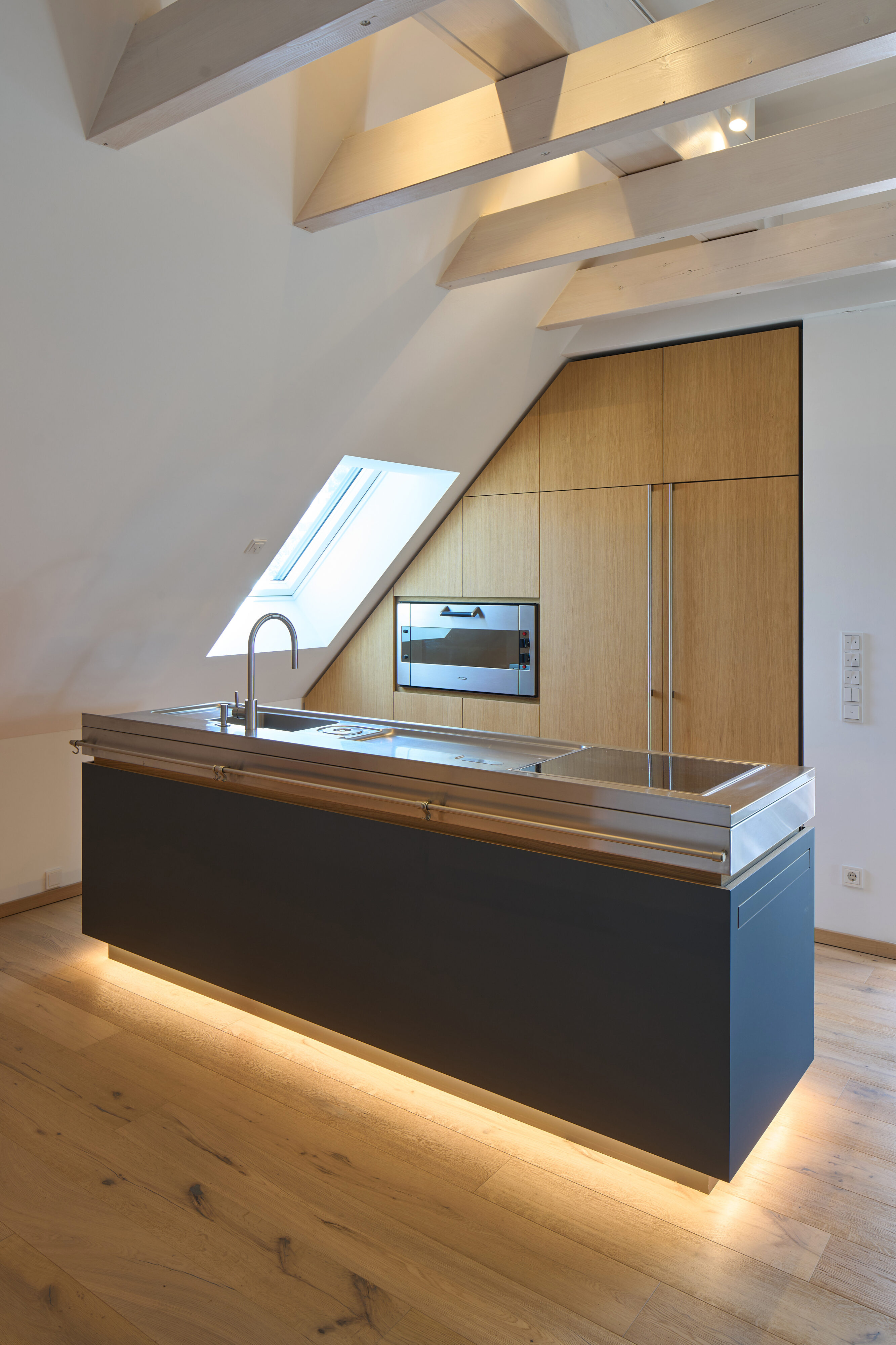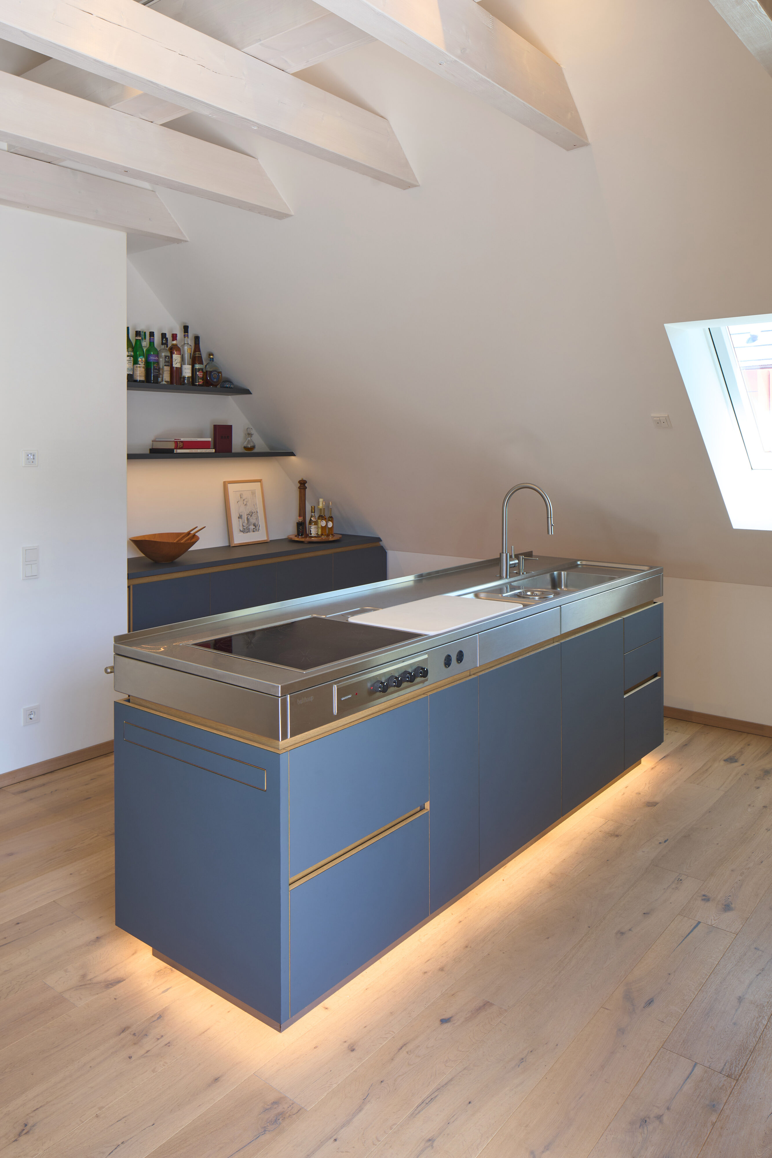 Der Ausgangspunkt dieses Küchenentwurfs war die, der Bauherrin über Jahrzehnte ans Herz gewachsene Bulthaup-Werkbank in Edelstahl. Diese wurden zum zentralen Element der Planung und mit einem mit Schüben bestückten Unterbau ergänzt. Ausgeführt wurde die „Werkbank“ mit grifflosen Fronten aus ultramattem, blauem Schichtstoff und feinen Eichendetails. Eine weitere Besonderheit im Küchenblock ist die integrierte Abstellgelegenheit, die sich per Tip-On ausfahren lässt. Der in die Dachschräge eingepasste Hochschrank ist in Eiche furniert gefertigt und betont den mitgebrachten Gaggenau-Backofen. Dieser beherbergt zudem eine Speisekammer. Auf der gegenüberliegenden Seite schaffen ein schwebendes Sideboard und Regalbretter in derselben Materialität zusätzlichen Stauraum und führen die Gestaltung ruhig weiter. So entstand eine Küche, die sich um ein persönliches Lieblingsstück gruppiert und diesem einen neuen Rahmen gibt.