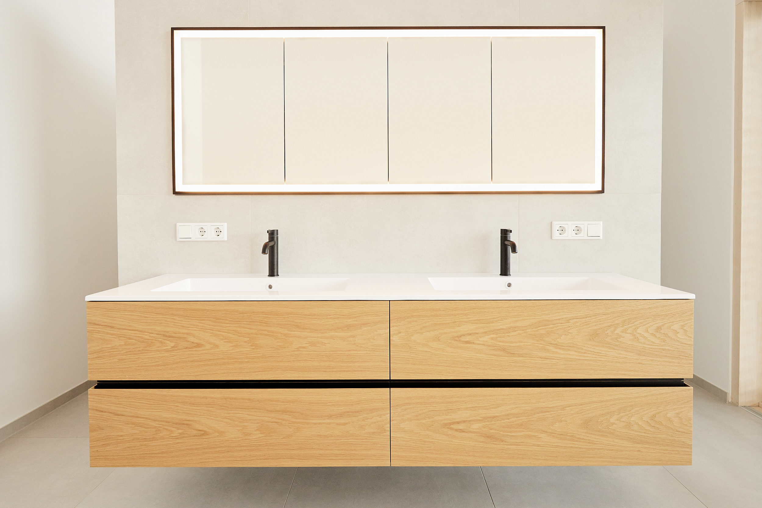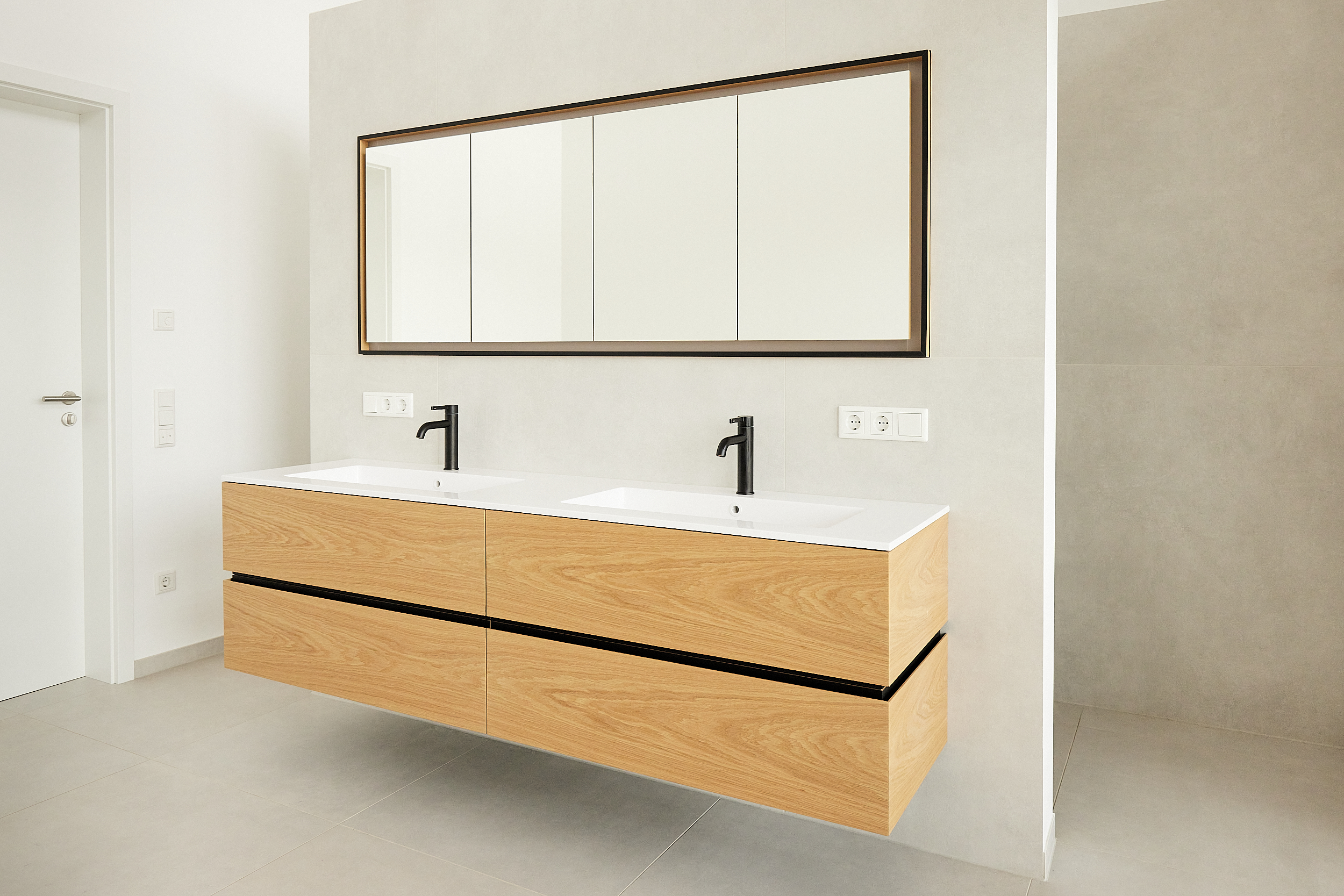 Der Entwurf dieser Küche entwickelte sich aus einer von Beginn an feststehenden Geräteauswahl. Der freistehende Kühlschrank bildete dabei den Ausgangspunkt. Dieser wurde mit Dampfgarer und Backofen in das in Eichen Lamellen Optik gestaltete Hochschrankelement integriert. Dazu kamen das groß dimensionierte Kochfeld mit frei nutzbaren Zonen, der dahinterliegende Down-Draft-Abzug sowie die Armatur mit Trinkwasserbereitung, welche in eine großzügig gestaltete Kochinsel eingefügt wurden, die die Funktionen bündelt und dem Raum eine klare Struktur gibt. Diese wurde in olivfarbenem Desktop-Linoleum ausgeführt. Die Kombination aus ruhiger Farbfläche und der vertikalen Gliederung der Lamellen verleiht der Küche eine ausgewogene und wohnliche Anmutung. So entstand ein zurückhaltender, präzise geplanter Küchenraum, der die technischen Anforderungen selbstverständlich aufnimmt und in ein stimmiges Gesamtbild überführt.